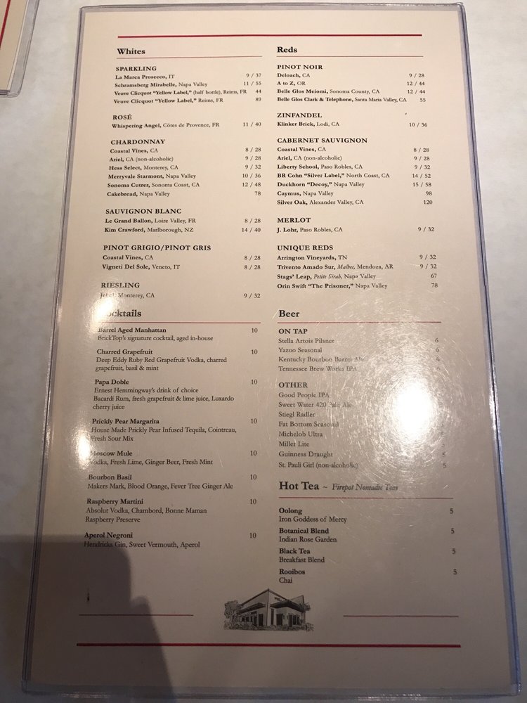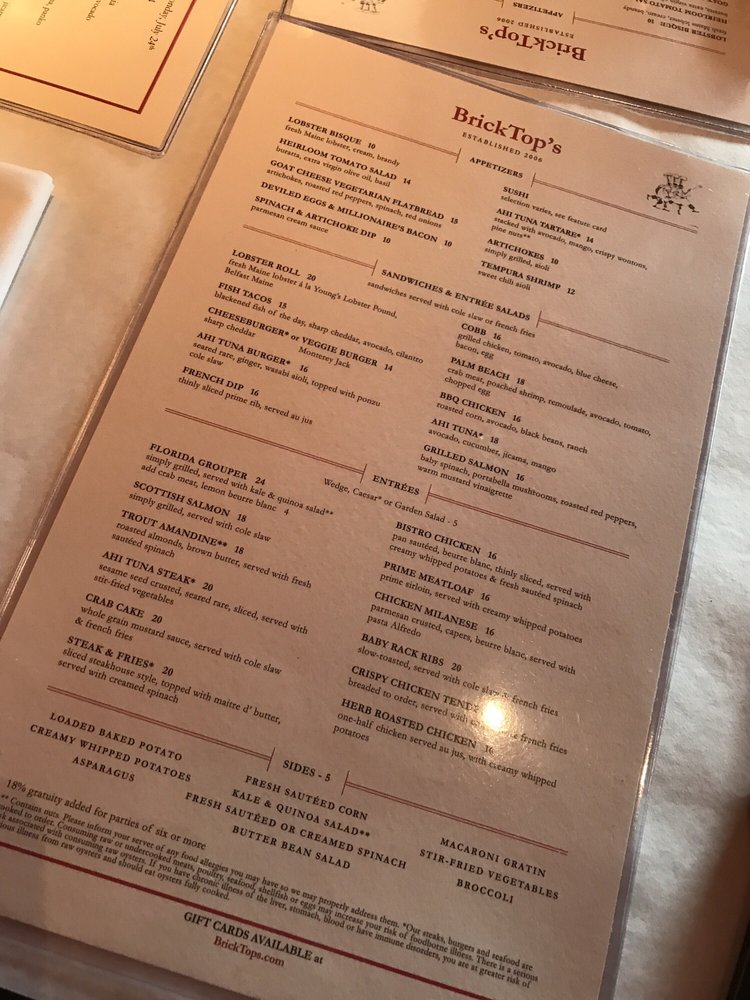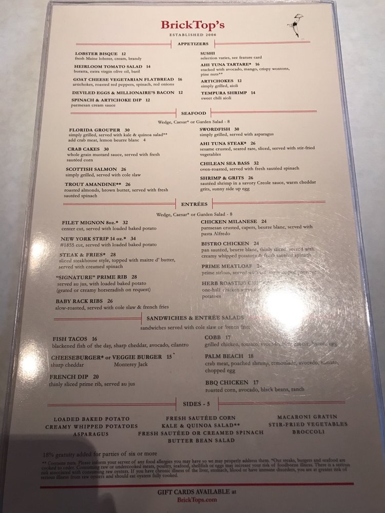 BrickTop's is a New American restaurant located in Nashville, TN. The menu offers a variety of options, including steak, crabcakes, salads, and gluten-free dishes like grilled trout and ahi tuna bowl. Customers praise the excellent service, delicious food, and elegant atmosphere. The restaurant provides a unique dining experience with creative salad presentations and a separate gluten-free menu. The highlight dishes include the prime rib, chicken Milanese, and shrimp and grits. The steak options are highly recommended, especially when paired with blue cheese crumble and Brussels sprouts. Overall, BrickTop's is a great choice for brunch, lunch, and dinner celebrations, with top-tier service, ambiance, and flavorful dishes.